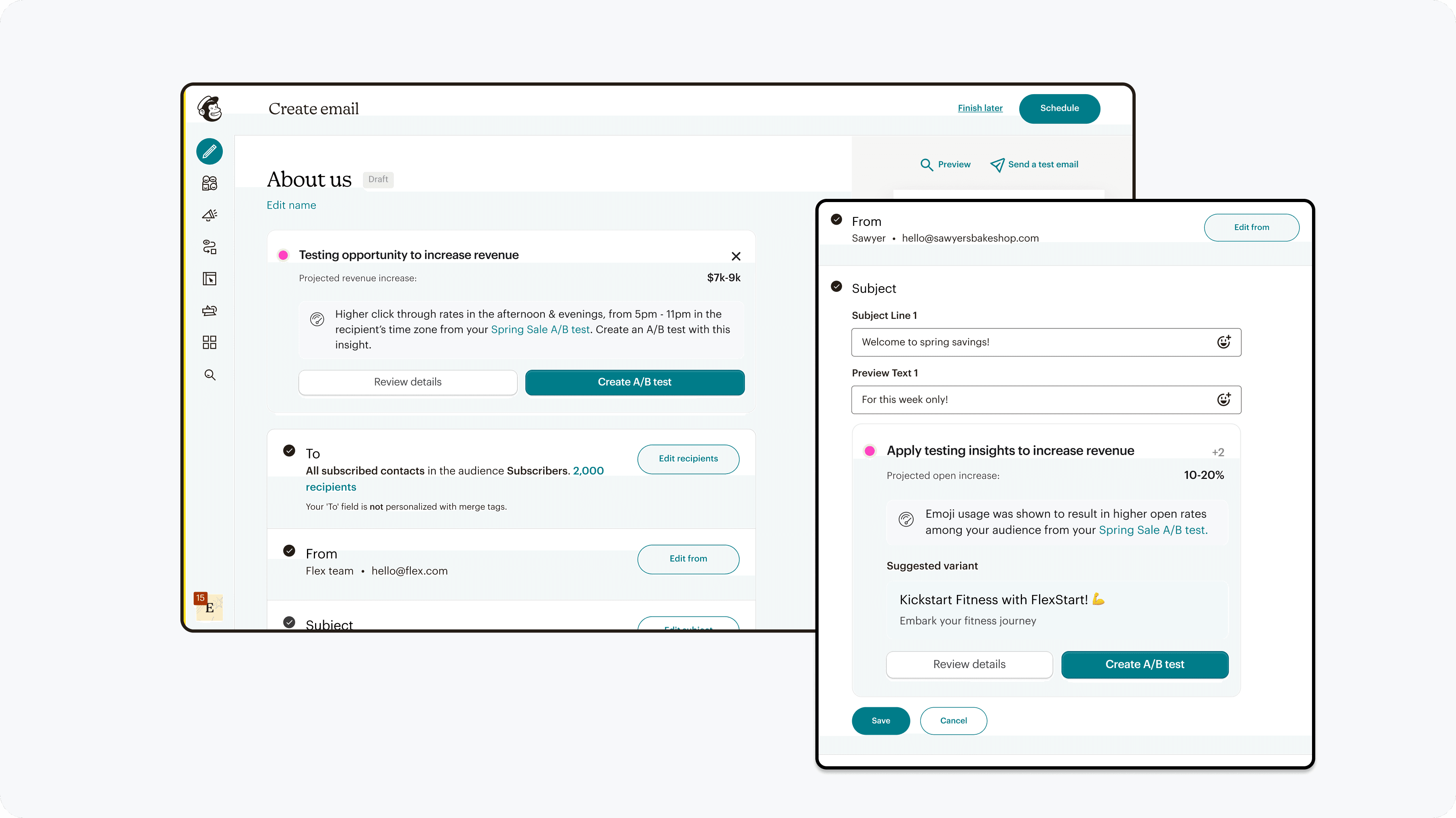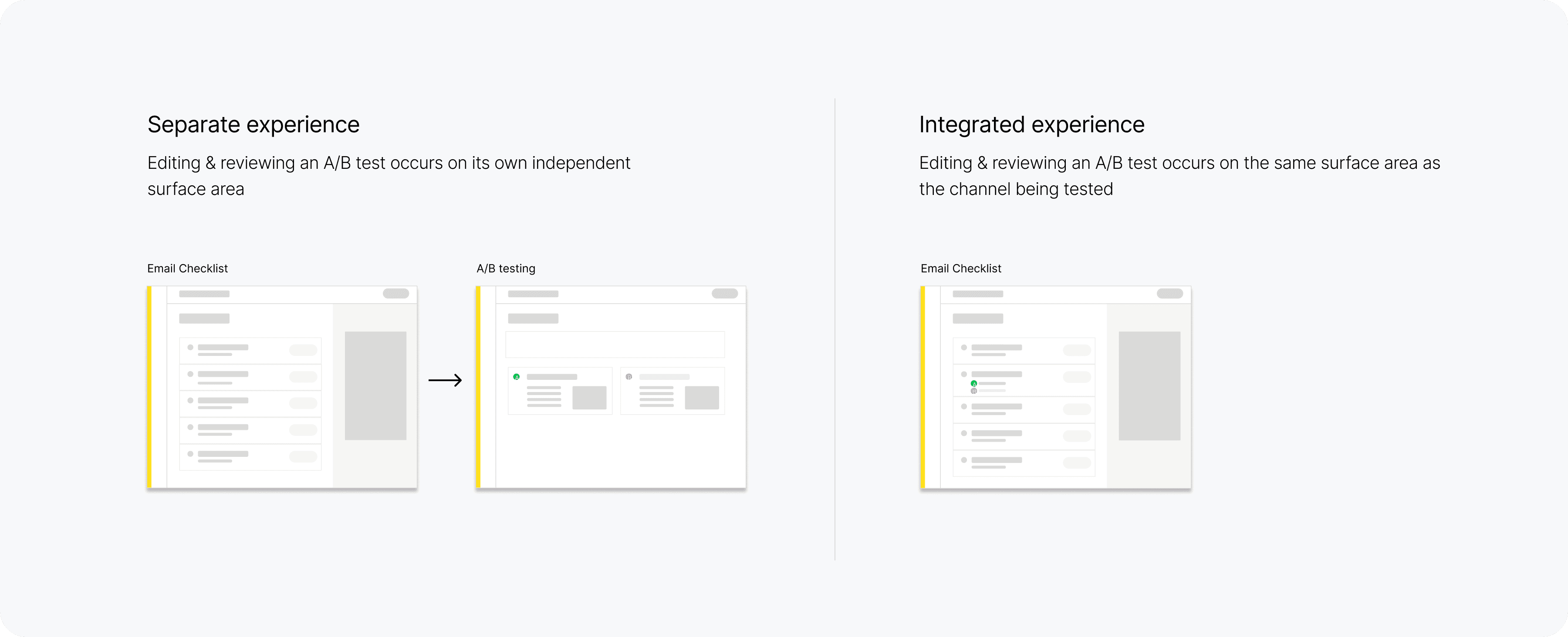A/B testing entry points were aligned with marketers' natural workflow of creating a base campaign and then adding a variable to test.