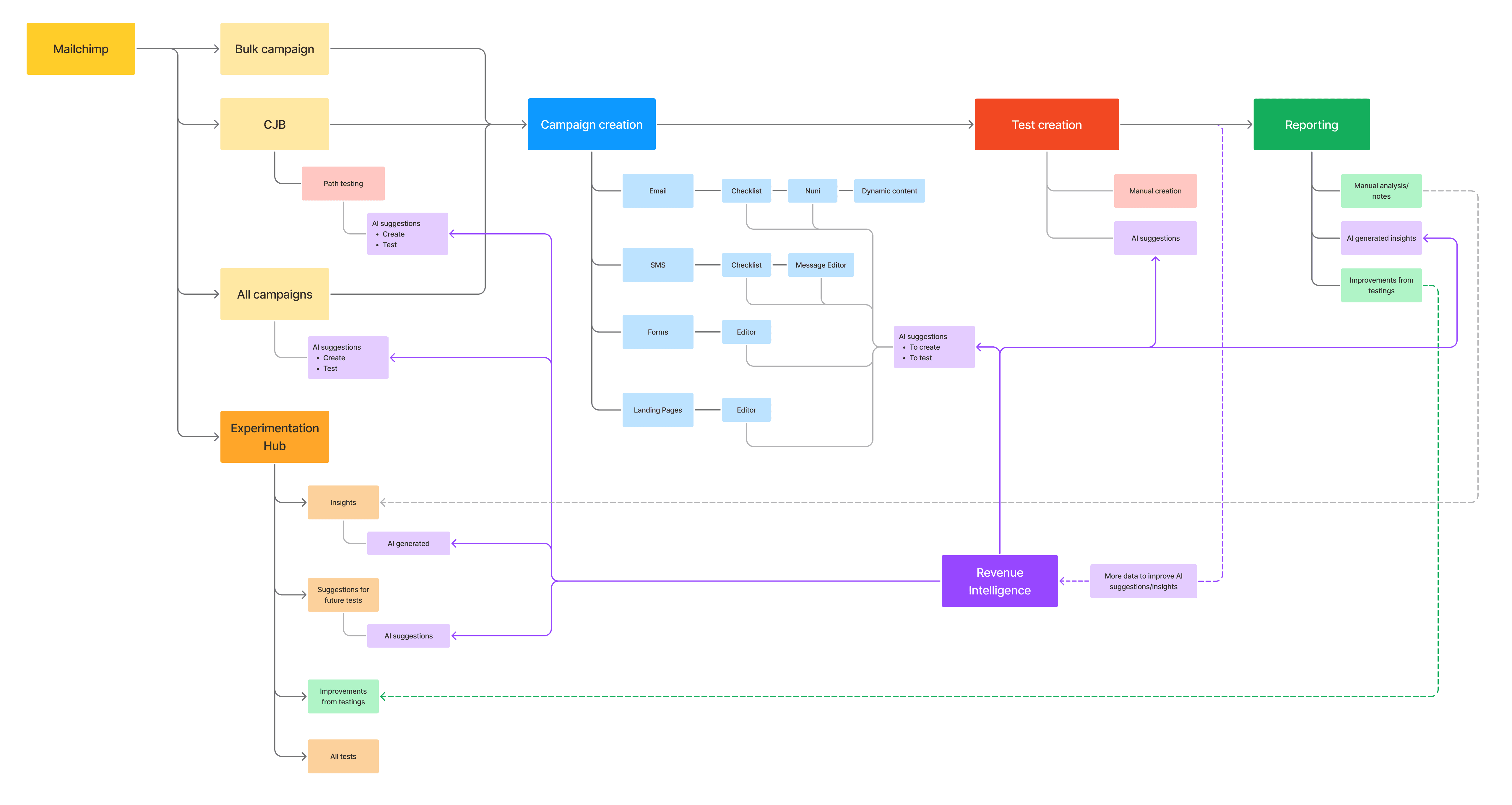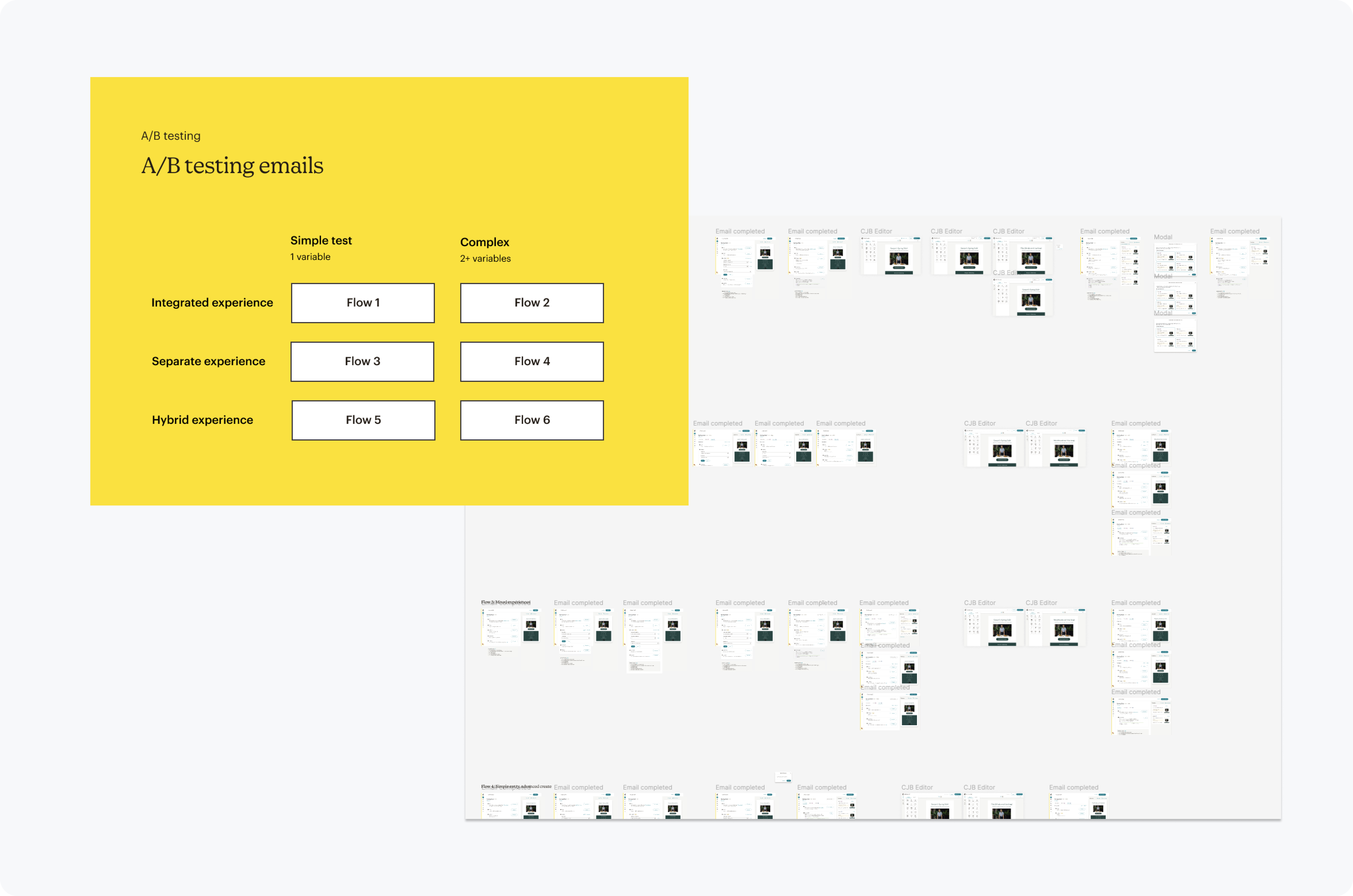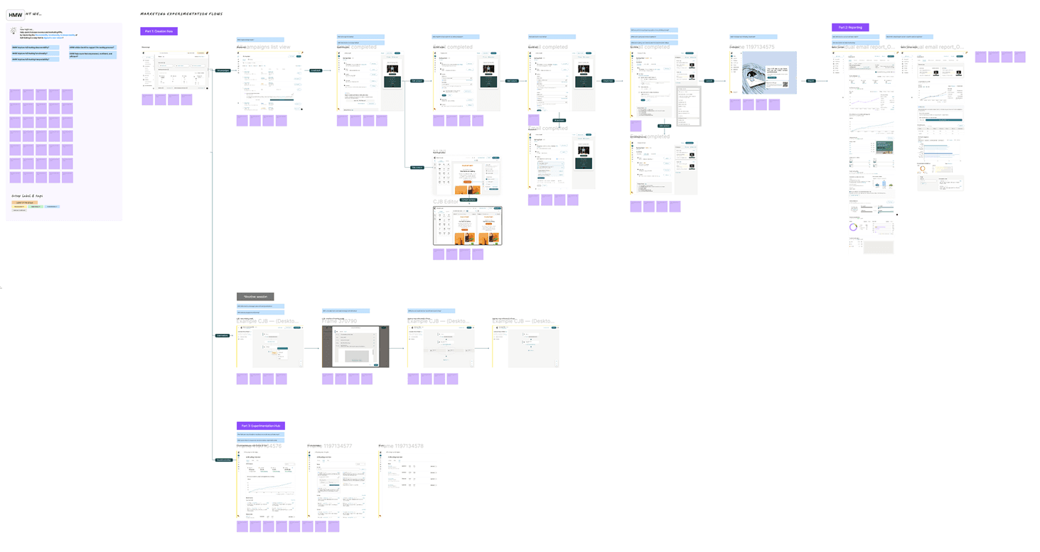 Creating a map of the overall user flow & touch points for A/B testing helped orient and contextualize the end to end experience throughout the design process.