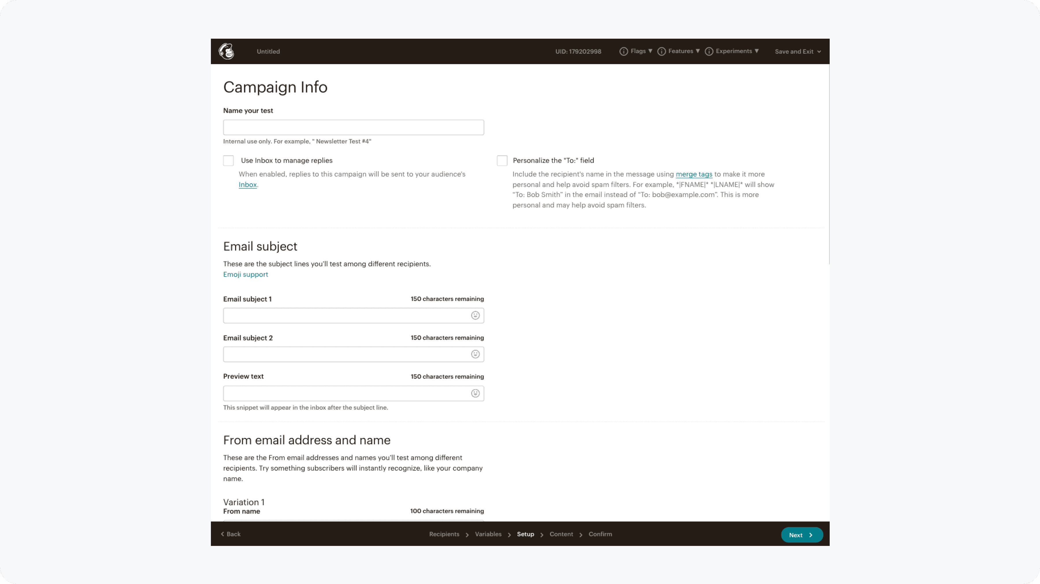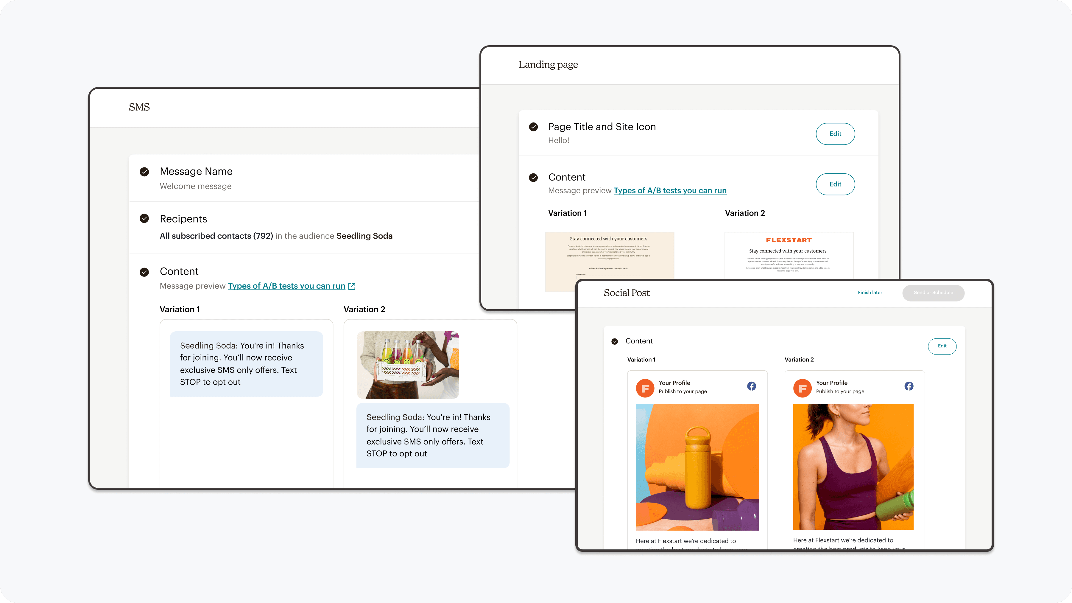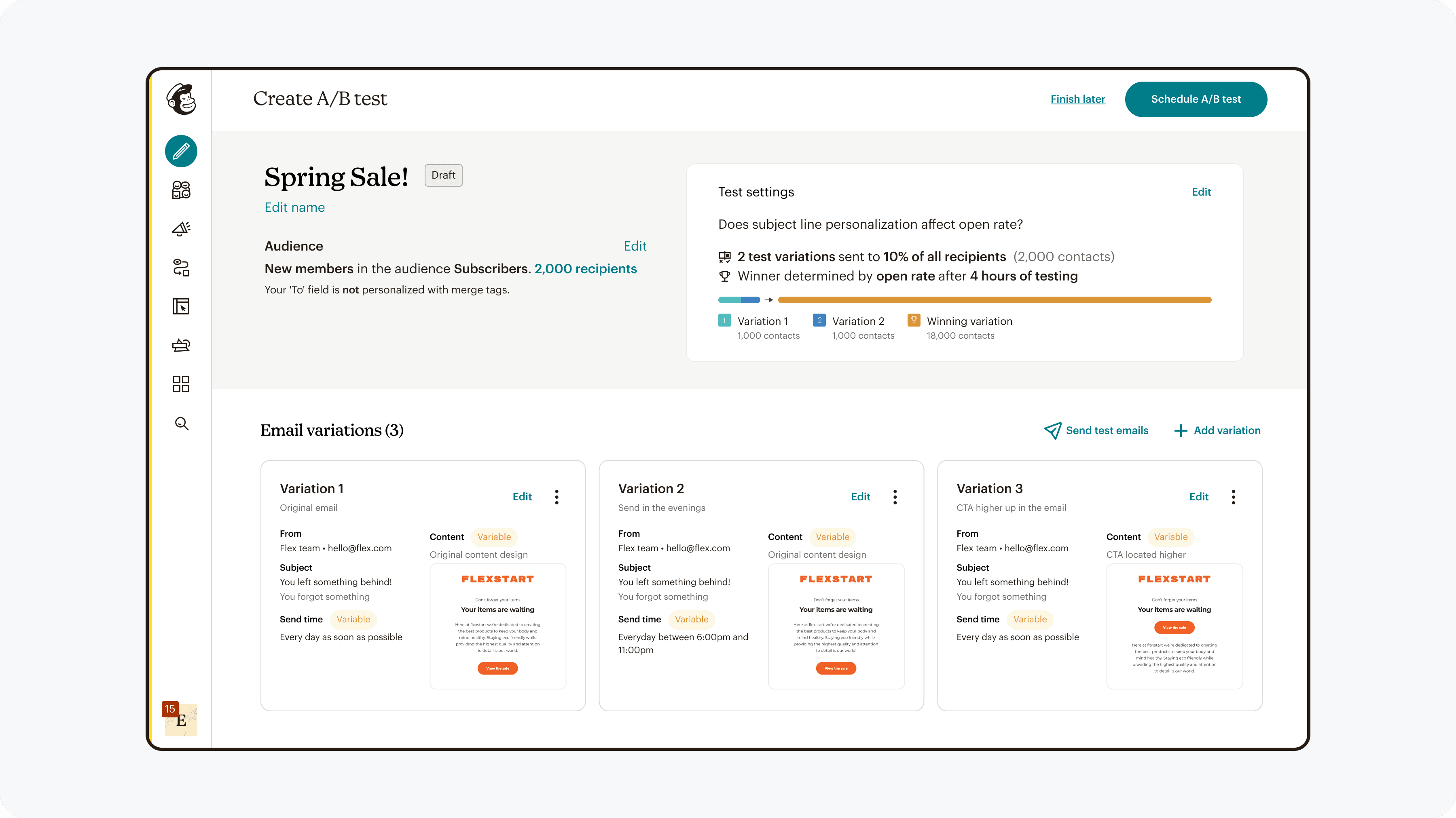 A workflow that is familiar when creating field variants while building the base campaign, and then clearly an A/B test when refining and reviewing test details.