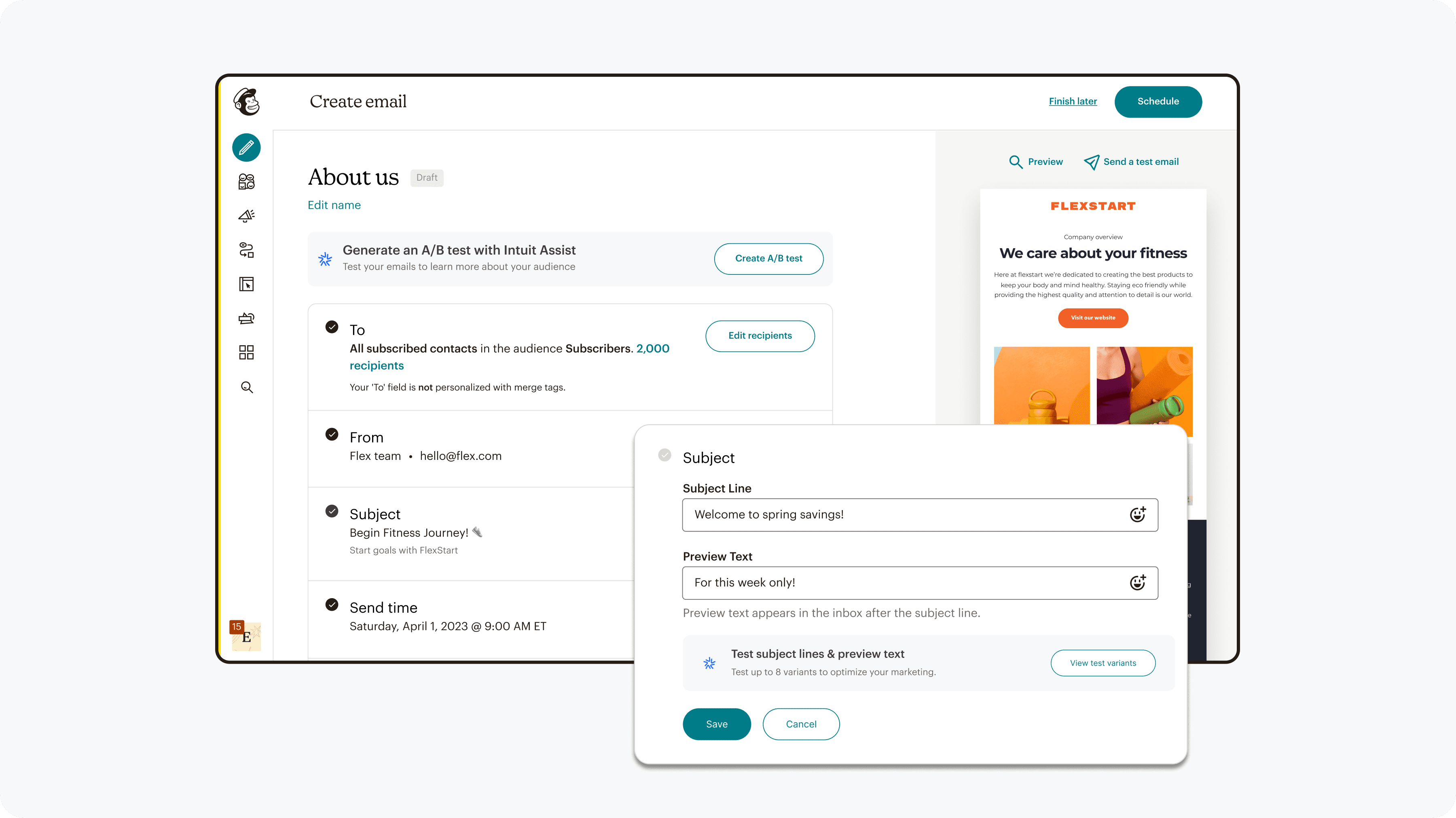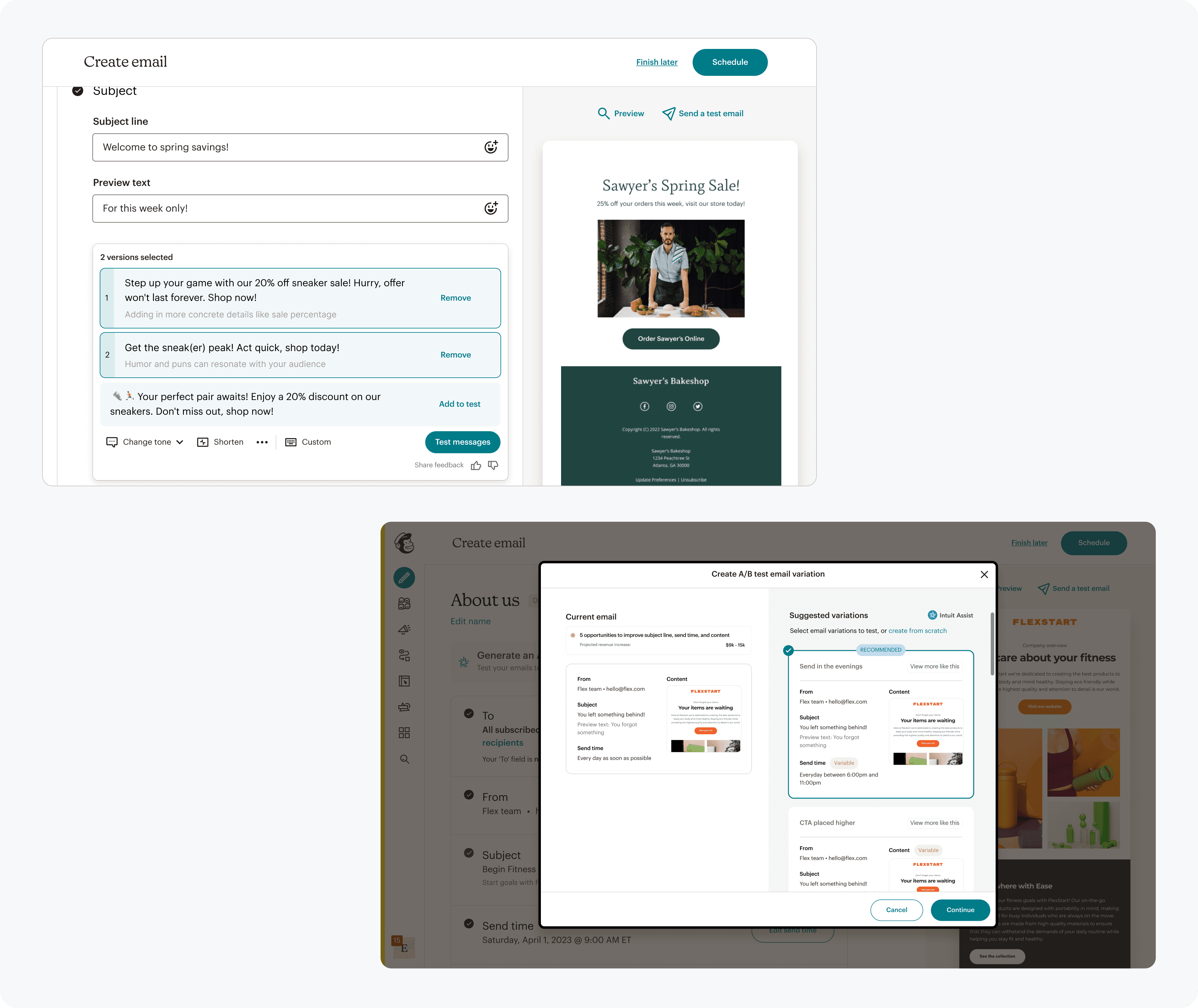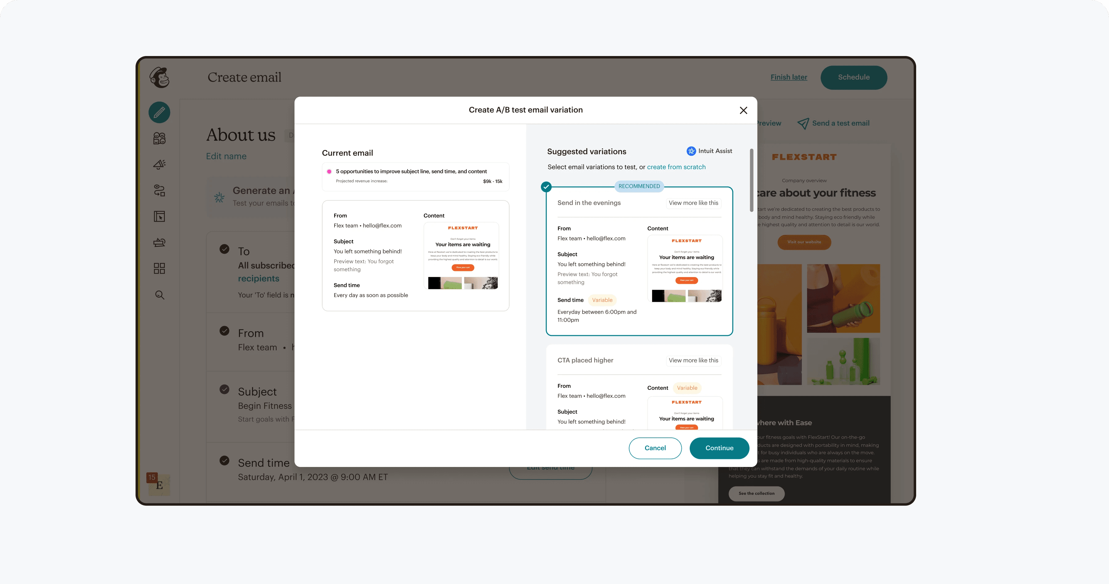A workflow that is familiar when creating field variants while building the base campaign, and then clearly an A/B test when refining and reviewing test details.